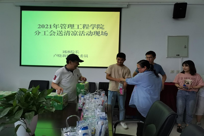 炎炎夏日送清凉,点滴关爱暖人心。入夏以来,由于天气持续高温、炽热,为做好防暑降温工作,确保教职工安全度夏,根据校工会的统一安排,管理工程学院分工会高度重视,积极部署,为教职工发放防暑降温用品。7月26日下午14时,管理工程学院全体新入职教师与学院在岗的教职工,一同分享校工会慰问的礼品。院长刘冰及校工会委员、副院长卢晓莉,满脸笑容将一份份夏季清凉的生活用品及夏季食品送到每位教师手中。上周五校工会便早已带给老师们一份份精神食粮----“庆祝建党100周年的观影票”,每位教师两张。新老师们感受到大家庭的温暖,体会到管理工程学院团队的精神风貌。(图为刘冰、卢晓莉发放慰问品)(图为部分慰问品展示)本次送清凉活动的开展,是学校党政领导和工会组织始终坚持的一项服务教师、关爱教师的活动与重要举措。一份清凉,一份关怀,把对教师的关心与爱护真正落到了实处,送清凉不仅送去了工会组织的关怀,也极大鼓舞了一线教师的工作热情和干劲。他们纷纷表示,虽然在炎炎夏日环境下工作,但已深切感受到了工会送来的丝丝清凉,在今后岗