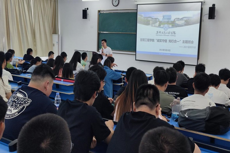 为提高大学生诚信意识和观念,让学生全面深入的了解国家各项资助政策,引导学生树立良好的诚信品德。5月23日,管理工程学院2021级专升本班通过主题班会及诚信签字的形式,教育同学们要诚信立身、诚信待人、诚信处事、诚信学习,做诚实守信的大学生,取得了较为显著的效果。诚实守信,知行合一/主题班会辅导员戴军森组织专升本全体同学开展了以“诚实守信、知行合一”为主题的班会活动,他详细的解读了各项国家资助政策,在如今的大好形势下作为新时代的青年,作为安信工的一名学生,要为拥有如此好政策而感到幸福,有了国家政策的支持,同学们的学习、生活不再那么艰难,与此同时也要把信工学子的诚信品质记在心间,在申报各项补助时牢记实事求是,不慌报,不虚报、不瞒报。临近期末,课程的结课考试也都即将到来,戴军森告诫各位同学做到诚信应考,严格遵守学校各项规定,强化诚信意识,树立良好的诚信品质。(召开主题班会)诚信于心,信于立身/诚信签名随后,辅导员组织班级全体同学在“诚信横幅”上签字,目的是为了进一步让同学们认识到、领会到“诚信”