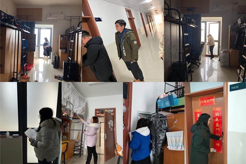 时光飞逝,寒假如期而至。为进一步做好学生寒假离校期间的宿舍安全与卫生保障工作,1月16日,管理工程学院全体辅导员深入学生寝室对学院500余间学生宿舍进行安全隐患大检查,核查学生离校情况,排查寝室安全隐患。各年级辅导员逐个走访学生寝室,重点检查电源开关、门窗、清洁卫生等涉及学生寝室安全用电和卫生情况的问题,对存在的安全隐患进行了及时的整改,预防假期各类安全事故发生。(图为各年级辅导员查寝)安全无小事,责任重于山。本次检查,学院学工队伍对宿舍进行全覆盖、无死角的排查,体现了学院对学生离校安全工作的高度重视,通过进一步排查学生宿舍各类安全隐患,确保了寒假期间学生宿舍的安全与稳定,筑牢疫情防控的坚实堡垒。
