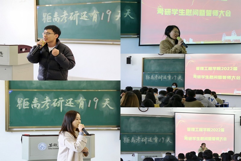 为了增进备战考研学子的信心,在距考研十九天的时间里调整心态,积极迎考,12月6日下午,管理工程学院在博行楼E102召开2022届考研学生慰问暨誓师大会。出席本次活动的有管理工程学院各教研室教师代表、学工秘书邓辰及全体2022届考研学生。大会由邓辰主持。首先,邓辰介绍了出席此次会议的教研室教师以及召开此次考研慰问誓师大会的目的,他充分肯定了管院同学在备考过程中艰苦的努力和付出,称赞了大家敢于拼搏的勇气,他强调学院时刻关心和牵挂着每一位考研同学,永远是大家最坚强的后盾和最温暖的港湾,他希望所有同学在最后的冲刺时刻调整好心态,保持好睡眠,以最佳状态迎接19天后的考试。接着,由国际经济与贸易、财务管理、市场营销、工商管理及工业工程专业教研室教师代表依次送上祝福,他们对各个专业的考研学生表达殷切的期望,希望同学们能够为了理想去奋斗,现在的磨砺会成就未来更辉煌的人生,祝福所有同学在此次考研中都能够成功上岸。最后,各个专业学生代表上台领取学院准备的慰问品。(图为各教研室教师代表讲话)(图为邓辰发言)(