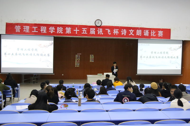 为弘扬优秀文化传统,提升大学生的文化素养,11月19日晚,管理工程学院第十五届“讯飞杯”诗文朗诵比赛在我校A1W101教室举办。此次大赛由19级辅导员戴军森、邵先龙,以及17级辅导员卫雨婷担任评委;史可晗担任本次比赛的主持人。 (比赛开幕) (选手比赛中)(选手比赛中) 此次比赛共有16组选手参加,选手分三轮依次进行自备诗文朗诵,评委老师对选手表现进行现场评分;并在每轮结束后由史可晗公布选手成绩得分。三轮结束后由工作人员对选手成绩进行统计。在此比赛中选手们都发挥得尤为出色有曹子陆,陈章怡,王秋晨三人齐诵《我的祖国》;有王剑成,周瑞二人合诵《大漠敦煌》,还有王宗毅一人独诵的《将进酒》。最终工管1921任金祥同学以95.1的高分成绩赢得第五届“讯飞杯”诗文朗诵比赛冠军,国贸1801王剑成和电信1802周瑞与工管1921王宗毅荣获此次比赛二等奖;工管1801鲍婉婷,财管1901魏莎莎与营销1801宋玉森和1802陆欣语取得三等奖佳绩。各获奖选手上台领奖并与评委老师合影留念后,史可晗宣布第十