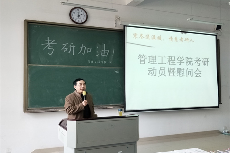 12月20日,距2020年全国研究生考试还剩下11天。在这最后的冲刺阶段,管理工程学院长刘冰、学工主管邓辰、辅导员戴友艳,为16级70余名拼搏了近大半年的考研学子召开了一场温暖人心的考研动员暨慰问会,并赠送发放了慰问品。会议开始,刘冰首先强调了研究生之于本科生的意义:研究生与本科生相比拥有更优质的资源、更广阔的视野,可以继续在自己喜爱的领域求学、求知、求新。再而谈到了他眼里的考研是一场成长的过程,坚持到现阶段的同学个人学习能力与意志品质肯定得到了很大的提升,而这样的备考过程相较于考试结果实则更有意义。同时,他通过管理工程学院历年考研人数和成功率节节攀升的数据为同学们打气,祝愿2020年考研莘莘学子取得理想成绩。接着,戴友艳通过自身的考研经验悉心叮嘱了同学们考试中的注意事项,她还告诉同学们,学院为他们购置了“考研爱心包裹”——透明文具袋、裁纸刀、中性笔、笔芯、纸巾、橡皮、纯牛奶……这些必备的考试文具与营养品摆满了整整两排的桌面。这些学院为大家提供的一份份心意希望能够助力考研学子完成最后的冲